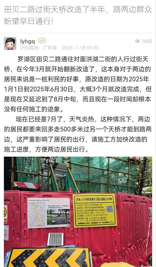 19. 帖文《田贝二路过街天桥改造了半年,路两边群众盼望早日通行!》