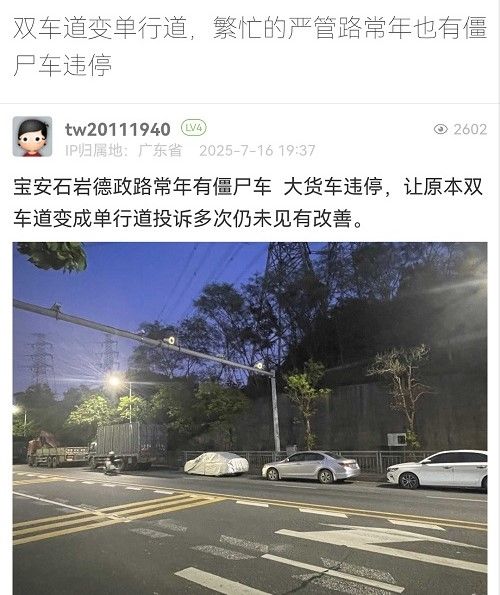 38. 帖文《双车道变单行道,繁忙的严管路常年也有僵尸车违停》