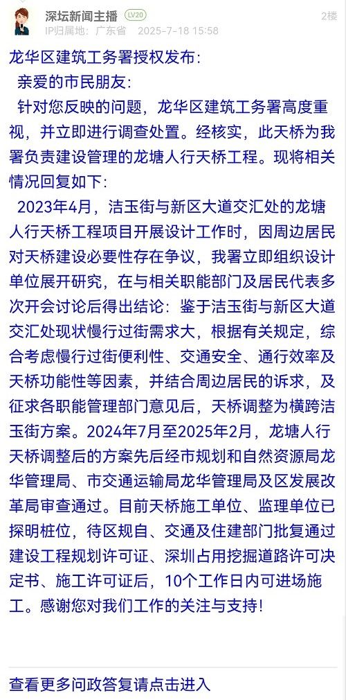 2023年4月,洁玉街与新区大道交汇处的龙塘人行天桥工程项目开展设计工作时,因周边居民对天桥建设必要性存在争议,我署立即组织设计单位展开研究,在与相关职能部门及居民代表多次开会讨论后得出结论:鉴于洁玉街与新区大道交汇处现状慢行过街需求大,根据有关规定,综合考虑慢行过街便利性、交通安全、通行效率及天桥功能性等因素,并结合周边居民的诉求,及征求各职能管理部门意见后,天桥调整为横跨洁玉街方案。2024年7月至2025年2月,龙塘人行天桥调整后的方案先后经市规划和自然资源局龙华管理局、市交通运输局龙华管理局及区发展改革局审查通过。目前天桥施工单位、监理单位已探明桩位,待区规自、交通及住建部门批复通过建设工程规划许可证、深圳占用挖掘道路许可决定书、施工许可证后,10个工作日内可进场施工。感谢您对我们工作的关注与支持!