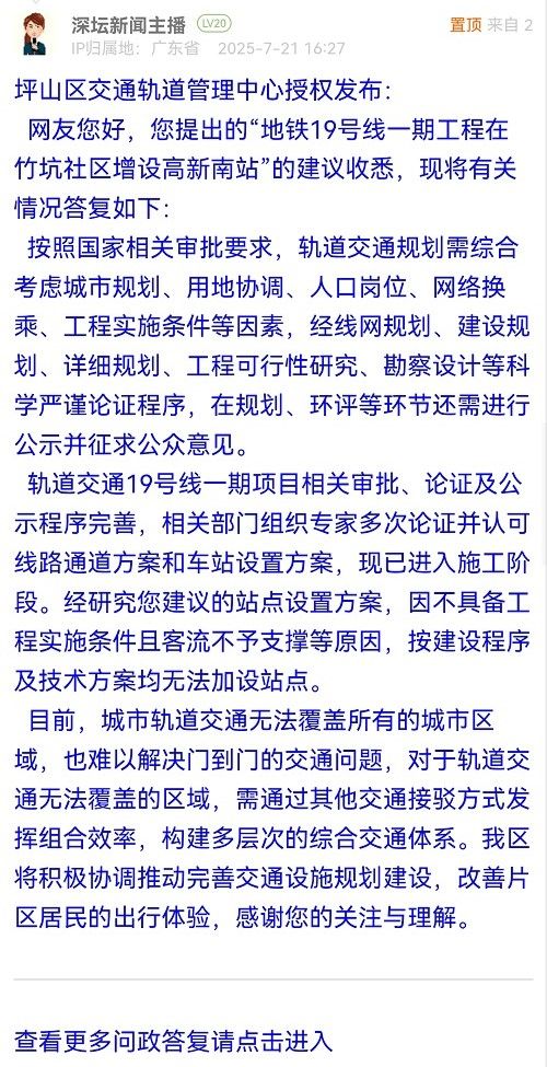 网友您好,您提出的“地铁19号线一期工程在竹坑社区增设高新南站”的建议收悉,现将有关情况答复如下: