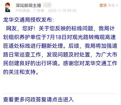 网友,您好!关于您反映的标线问题,我局计划组织养护单位于7月18日对观光路转梅观高速匝道处标线进行翻新处理。后续,我局将加强道路日常巡查工作,发现问题及时处置,为广大市民创建良好的出行环境。感谢您对龙华交通工作的关注和支持。