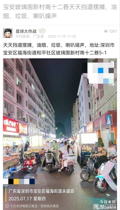 28. 帖文《宝安玻璃围新村南十二巷天天挡道摆摊,油烟、垃圾、喇叭噪声》