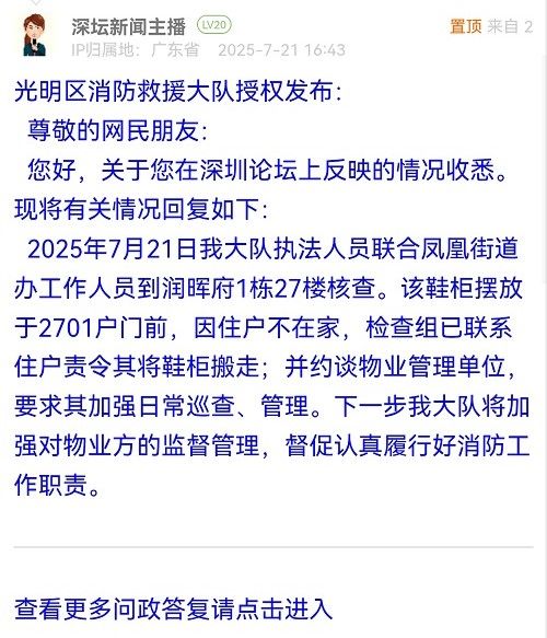 2025年7月21日我大队执法人员联合凤凰街道办工作人员到润晖府1栋27楼核查。该鞋柜摆放于2701户门前,因住户不在家,检查组已联系住户责令其将鞋柜搬走;并约谈物业管理单位,要求其加强日常巡查、管理。下一步我大队将加强对物业方的监督管理,督促认真履行好消防工作职责。