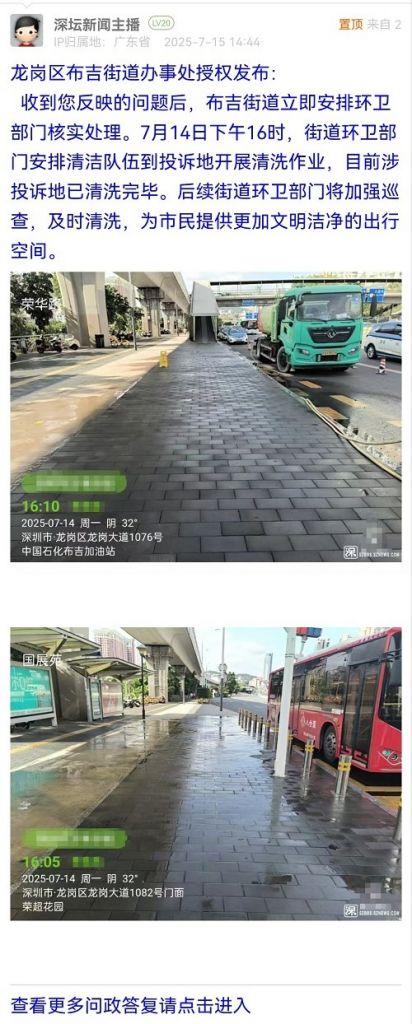 3. 帖文《龙岗区龙岗大道公交车站长期明显大面积油污污迹、很脏,没人处理(四)》