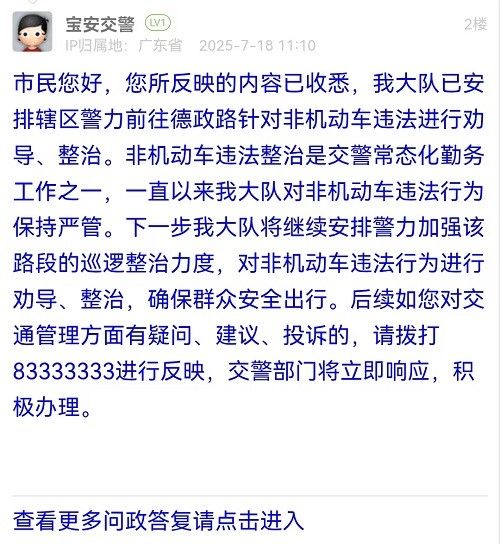 市民您好,您所反映的内容已收悉,我大队已安排辖区警力前往德政路针对非机动车违法进行劝导、整治。非机动车违法整治是交警常态化勤务工作之一,一直以来我大队对非机动车违法行为保持严管。下一步我大队将继续安排警力加强该路段的巡逻整治力度,对非机动车违法行为进行劝导、整治,确保群众安全出行。后续如您对交通管理方面有疑问、建议、投诉的,请拨打83333333进行反映,交警部门将立即响应,积极办理。