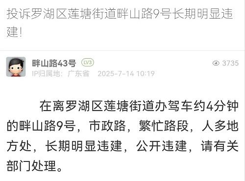 1. 帖文《投诉罗湖区莲塘街道畔山路9号长期明显违建!》