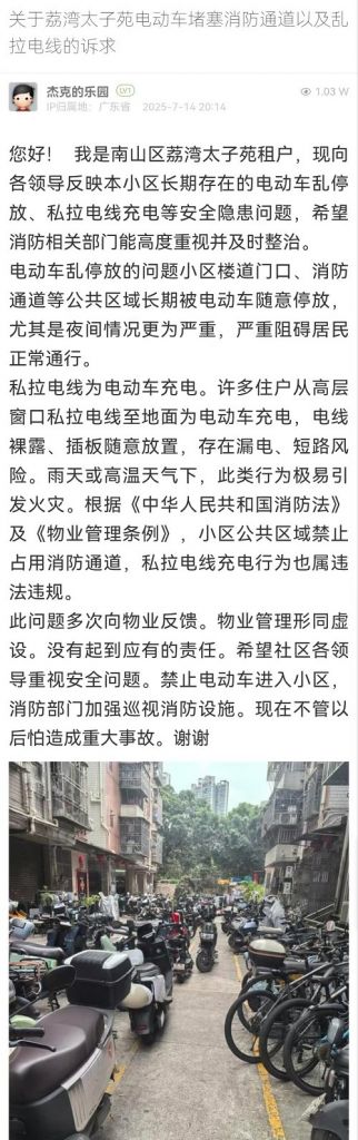 5. 帖文《关于荔湾太子苑电动车堵塞消防通道以及乱拉电线的诉求》