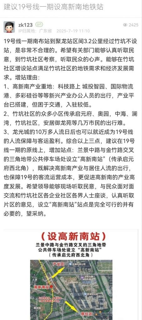 27. 帖文《建议19号线一期设高新南地铁站》