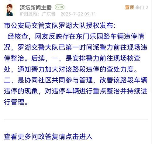 经核查,网友反映存在东门乐园路车辆违停情况,罗湖交警大队已第一时间派警力前往现场违停整治。后续,一、是安排警力前往现场核查处,通知警力加大对该路段违停的查处力度。二、是协同社区共同参与管理,改善该路段车辆违停的现象,对违停车辆进行重点整治并持续进行管理。