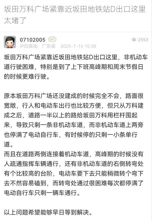2. 帖文《坂田万科广场紧靠近坂田地铁站D出口这里太堵了》