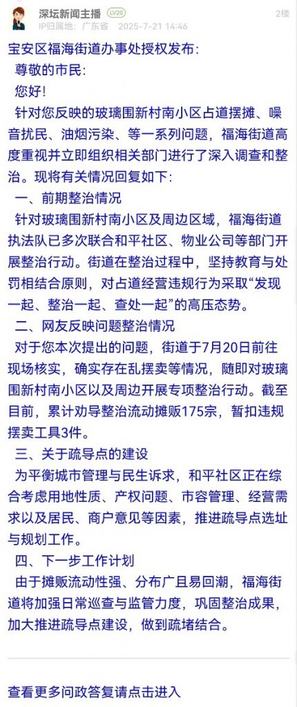 针对玻璃围新村南小区及周边区域,福海街道执法队已多次联合和平社区、物业公司等部门开展整治行动。街道在整治过程中,坚持教育与处罚相结合原则,对占道经营违规行为采取“发现一起、整治一起、查处一起”的高压态势。