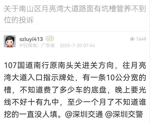 31. 帖文《关于南山区月亮湾大道路面有坑槽管养不到位的投诉》