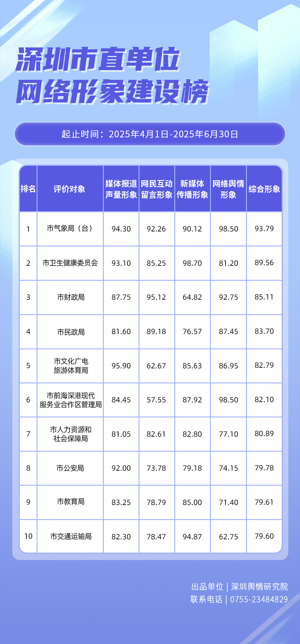 4-6月,市气象局、市卫生健康委员会、市财政局、市民政局、市文化广电旅游体育局、市前海深港现代服务业合作区管理局、市人力资源和社会保障局、市公安局、市教育局、市交通运输局在网络形象建设工作方面表现相对突出,登上《深圳市直单位网络形象建设榜》。其中,市气象局、市卫生健康委员会的网络形象建设工作持续走在前列,其他上榜单位各展所长,在网络宣传、互动回应等方面积极作为,共同塑造深圳市直单位良好网络形象。