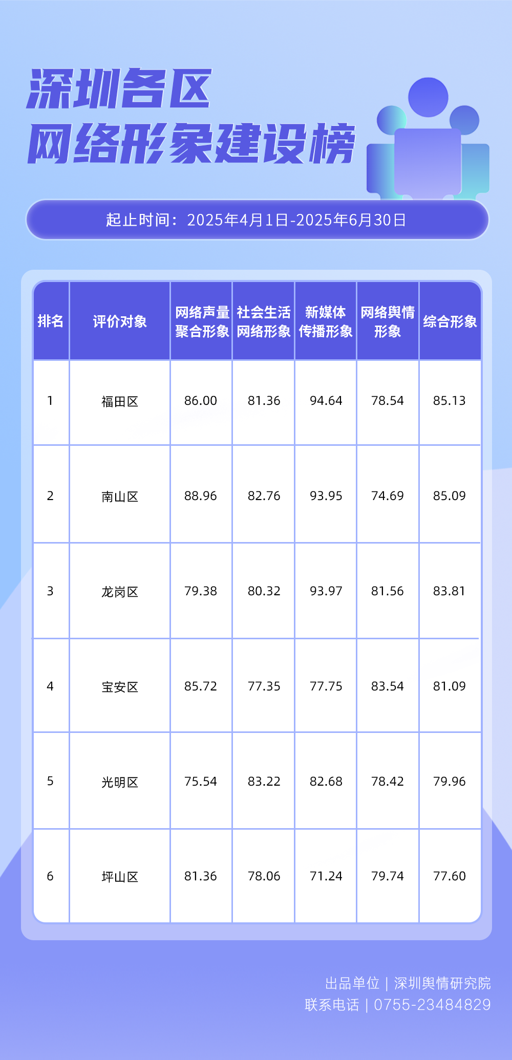 4-6月,福田区、南山区、龙岗区、宝安区、光明区、坪山区登上榜单前六。其中,福田区、南山区、龙岗区位居榜单前三名,在新媒体传播形象、社会生活网络形象等多个指标上表现出色,综合评价分值在85分左右。宝安区、光明区、坪山区紧随其后,在各项网络形象建设工作中持续发力,彰显出了各区网络形象建设的协同共进之态。