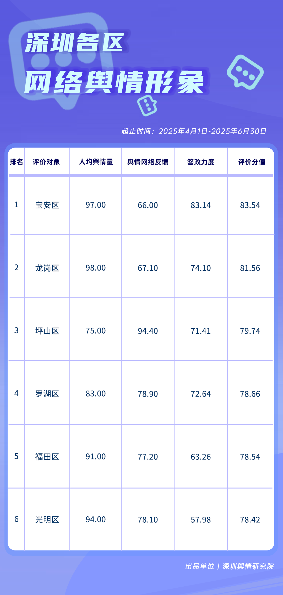 4-6月,在网络舆情方面,宝安区、龙岗区凭借较低的人均舆情量、较好的答政效果,位居榜单前二;坪山区、罗湖区、福田区、光明区也跻身前列,以优异分数展现其在网络舆情工作中的积极成效,彰显了各区在营造良好网络舆情环境、及时回应网民诉求上的主动担当。