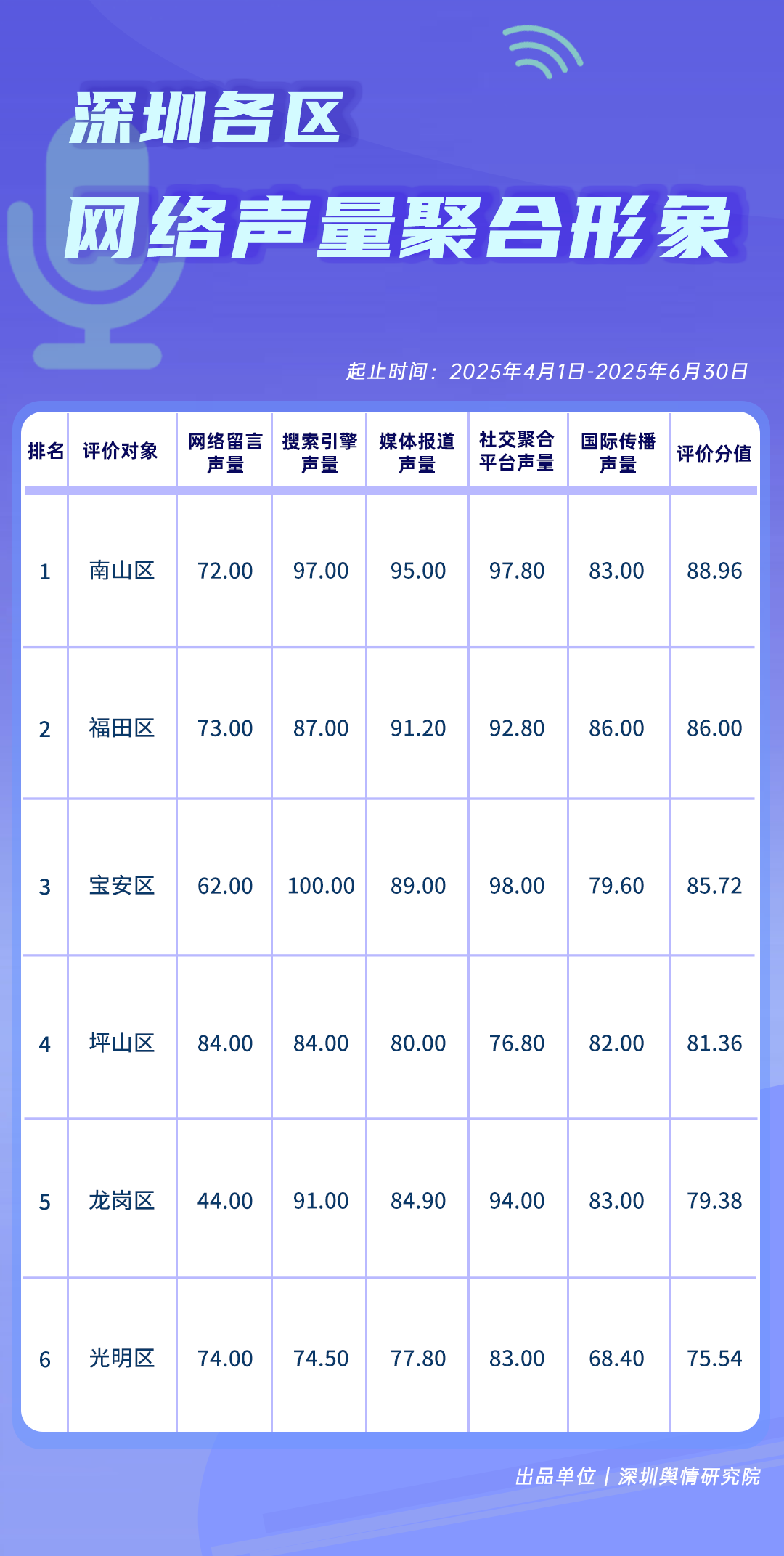 4-6月,《深圳各区网络声量聚合形象榜》中,南山区凭借各项声量指标的优异表现,以88.96分荣登榜首,福田区、宝安区紧随其后,在搜索引擎声量、媒体报道声量等指标上均斩获高分,反映出市民及媒体对区域给予较高关注。坪山区、龙岗区、光明区也位居前列,表现不俗,为提升城市数字治理能级注入了源源不断的动力。