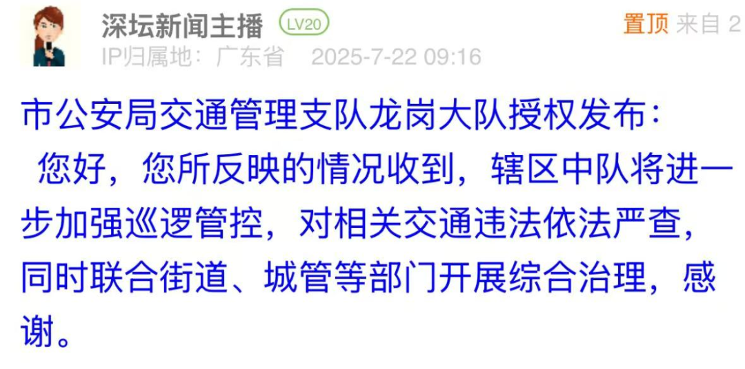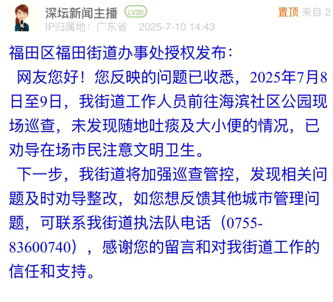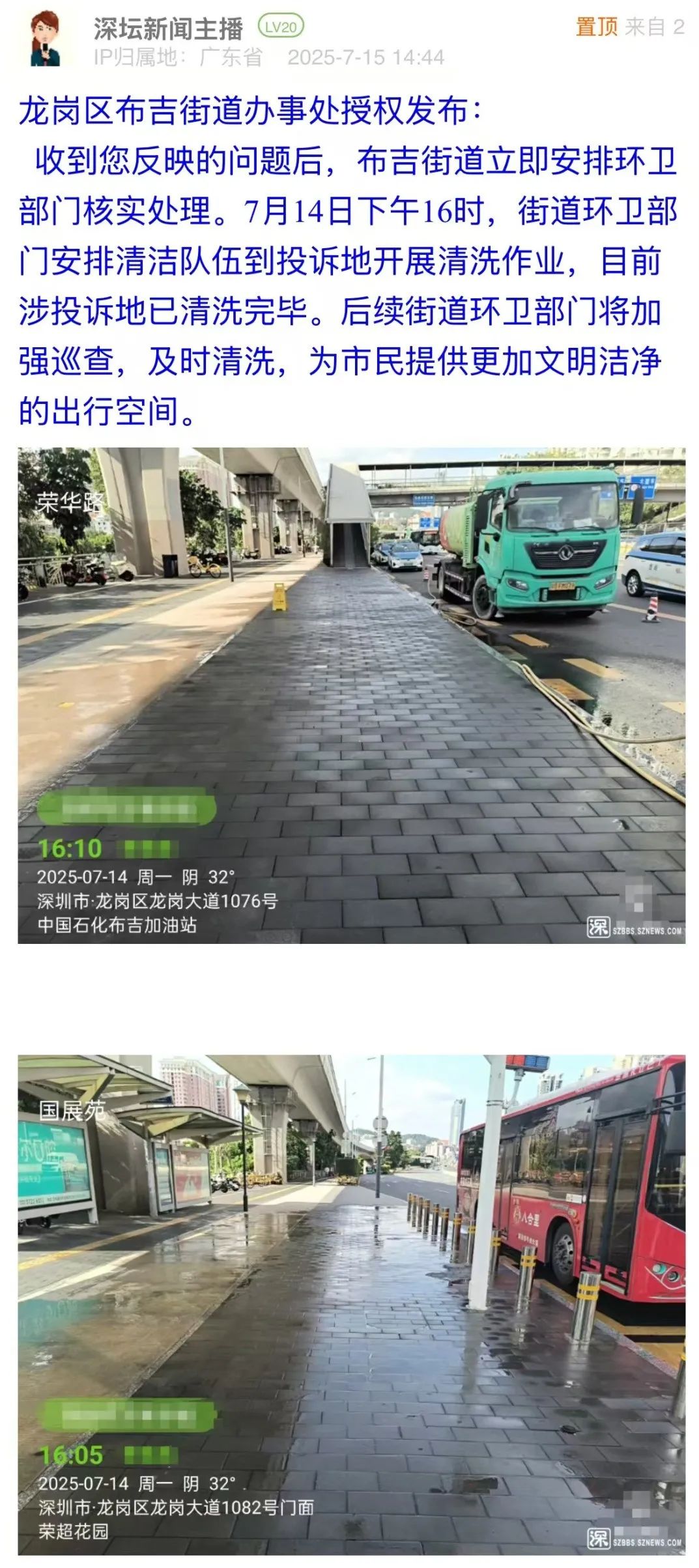 案例点评:对于市民反映的路面油污问题,布吉街道办立即安排环卫部门进行清洗,并于第二日在问政帖文下进行回复,以现场图片展示路面清理效果,表示将加强后续巡查。此次处置展现了基层部门高效务实的问题处理能力,为城市道路环境管理提供了快速响应与长效维护相结合的实践范例,切实回应了市民对洁净环境的期待。