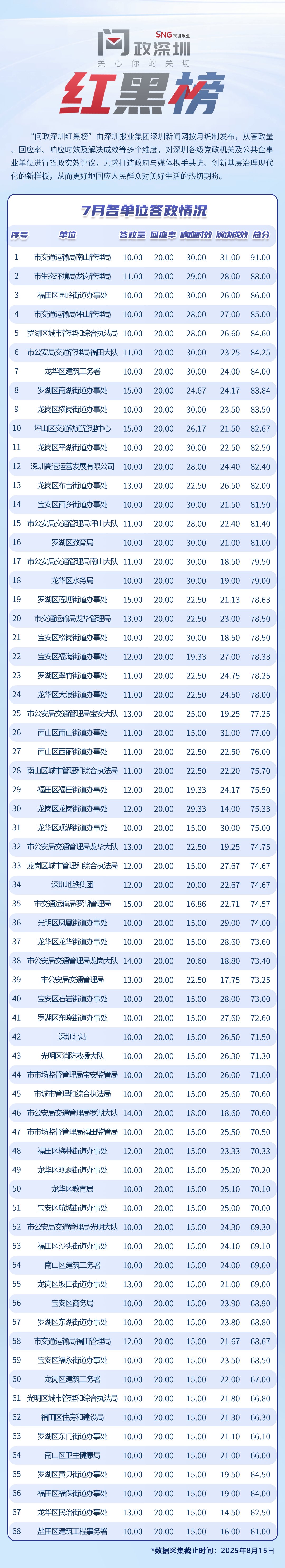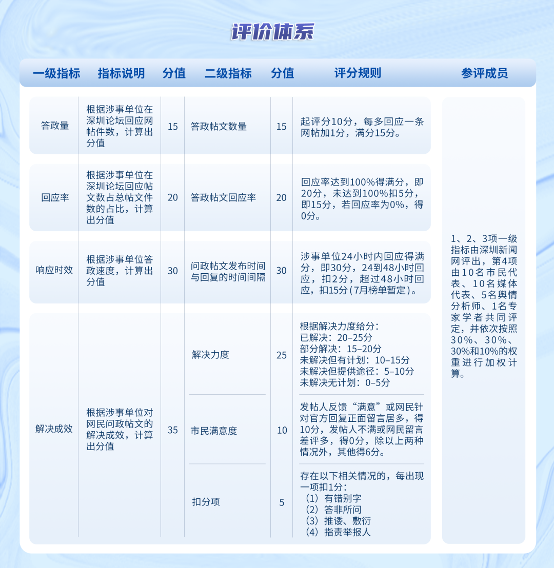 “问政深圳红黑榜”具有科学、合理、完备的综合评价体系,能够综合评估深圳各级党政机关和公共企事业单位的答政情况。