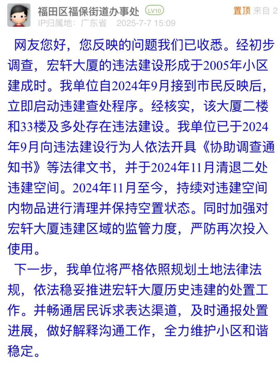 3、有市民反映福田区一大厦存在违建,希望有关部门关注处理