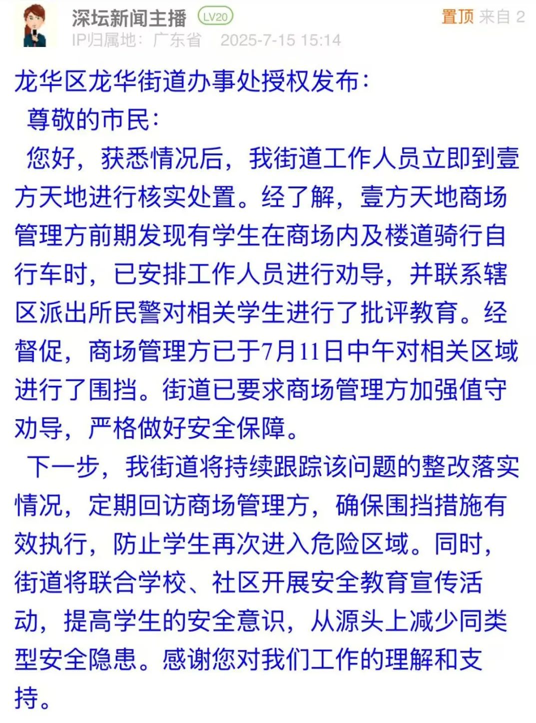 2、有市民反映龙华区壹方天地内有学生危险骑行,质疑商场安全监管不足