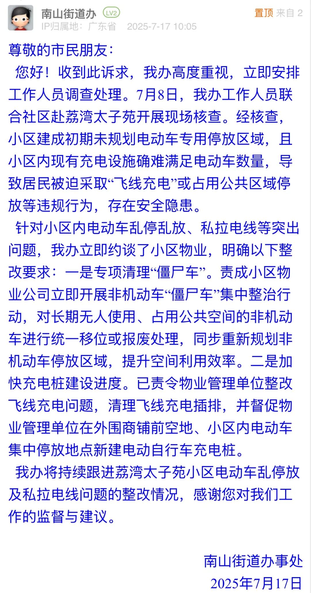 针对小区内电动车乱停放、私拉电线等存在安全隐患的行为,南山街道办接诉后迅速联合社区核查,说明了历史规划不足的核心病因,通过约谈物业推动整改,从“应急响应”到“系统治理”的务实举措,回应了市民对消防通道畅通、用电安全的关切,以“标本兼治”的治理思路,为老旧小区电动车管理提供了可复制的解决方案。