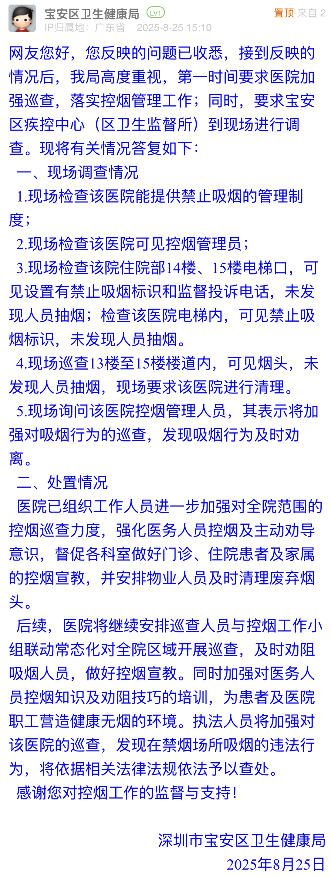 优化建议:接到市民反馈后,宝安区卫生健康局快速组织现场调查,核实医院有禁烟制度、控烟管理员在岗,基础控烟措施核查到位,值得点赞。但回应中多次强调“未发现人员抽烟”,回避对历史吸烟行为处置、烟头来源及劝阻机制失效的解释,与市民关切脱节,难以消除市民对医院日常控烟能力的担忧,建议完善具体控烟措施,如加装烟感报警装置,建立核查公示制度等,筑牢“无烟医院”防线。