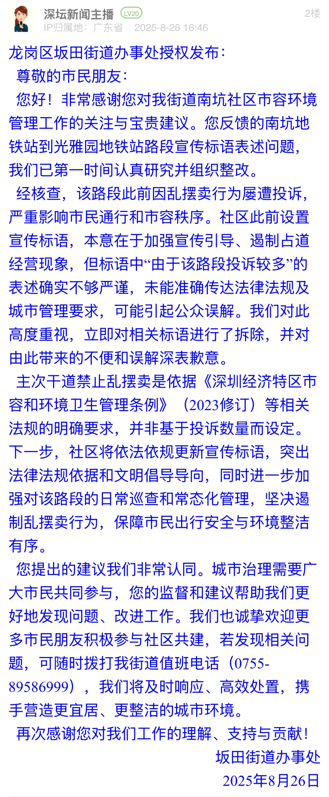 案例点评:标语表述不严谨可能引发公众误解,坂田街道办展现出高效务实的态度,第一时间拆除涉事标语,计划更新标语,明确标语中提及的禁摆依据为法规要求而非投诉数量。回应中,街道主动致歉并公开整改逻辑,展现“直面问题不推诿”的担当,更以“邀请市民参与共建”为切入点,构建“政府主导+公众监督”的治理闭环。此次整改有效化解因标语表述不当引发的公众疑虑,彰显了“以民为师”的共治智慧。