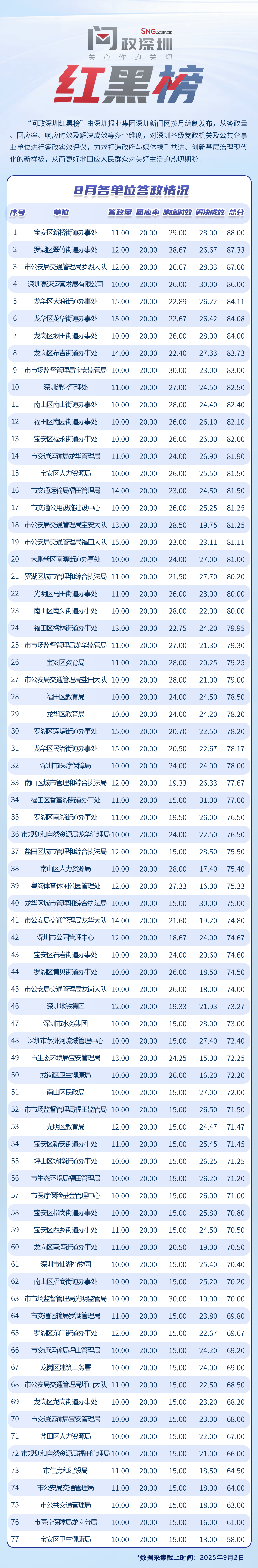 为探寻媒体如何精准赋能基层治理现代化的“深圳路径”,深圳报业集团正式挂牌成立“问政深圳”工作室,旨在进一步推动网络问政工作的高效开展。为确保相关工作更加契合实际需求,自上期起,深圳报业集团深圳新闻网按照“最快速度办结”的总体要求,将原有月度榜单创新升级为“问政深圳红黑榜”,并对评分体系进行了细致优化。该榜单从答政量、回应率、响应时效及解决成效等多个维度,对深圳各级党政机关及公共企事业单位进行答政实效评议,力求打造政府与媒体携手共进、创新基层治理现代化的新样板,从而更好地回应人民群众对美好生活的热切期盼。