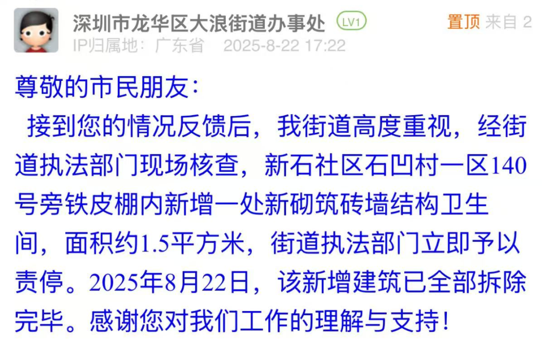 案例点评:8月21日晚间,市民发布帖文反映违建问题,大浪街道以“雷霆处置”展现安全至上的治理担当。接到投诉后,街道迅速核查,在22日给出回应,表示已完成拆除工作,做到了“速办速结,质效双优”。此次响应既体现“隐患即事故”的底线思维,更以“发现即拆除”的高效行动,彰显基层治理对民生安全的敏锐感知与果断处置能力,切实筑牢居民“身边安全”防线。