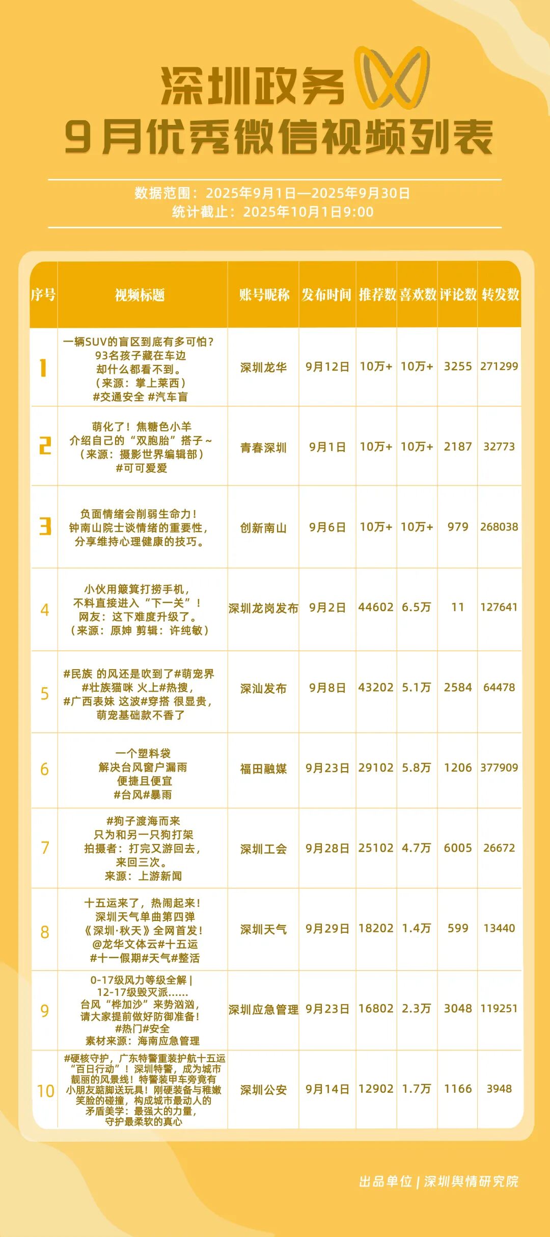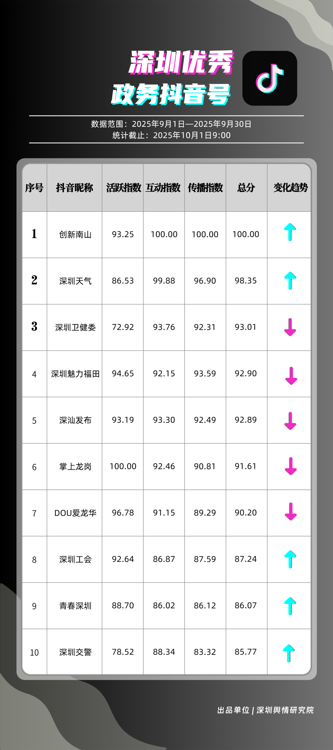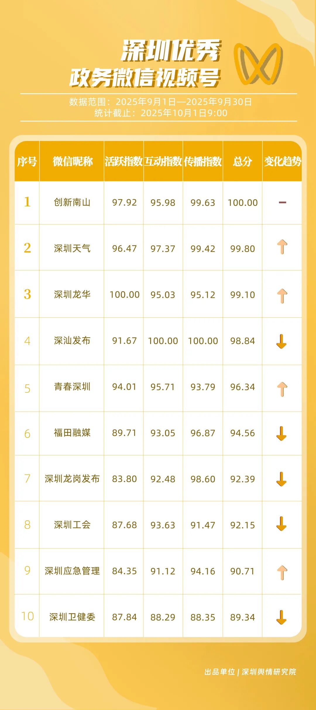 9月,深圳政务新媒体矩阵持续优化内容生态,各单位依托平台特色深化服务效能,南山区、市卫生健康委员会、市气象局(台)、龙岗区、福田区、龙华区、深汕特别合作区、市应急管理局、中国共产主义青年团深圳市委员会、光明区的新媒体矩阵入选“深圳优秀政务新媒体矩阵”榜单。9月,南山区在短视频平台表现突出,抖音、微信视频号平台均获满分;市卫生健康委员会输出深度内容,位列榜单第二;市气象局(台)新媒体矩阵居于榜单第三,在9月发布台风相关天气提醒,获得公众广泛关注。此外,龙岗区、福田区、龙华区、深汕特别合作区新媒体矩阵持续推出优质内容,共同展现了深圳在塑造现代化形象、提升数字治理能力上的创新引领作用。