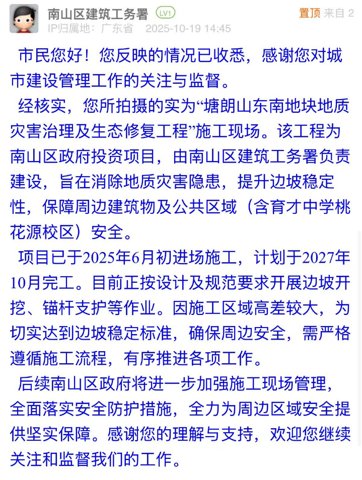 案例点评:针对市民疑虑,相关部门的回应展现出“透明化+精细化”的治理思路:第一时间明确工程属性并同步告知工期安排,主动消解市民对工程进展的不确定性担忧;同时,南山区建筑工务署还表示后续将进一步加强现场管理,回应关切。这种回应思路既解决了市民的困惑,也通过可感知的举措传递了对安全的重视态度,是城市工程类诉求处置中“信息公开”“风险闭环”的有效示范。