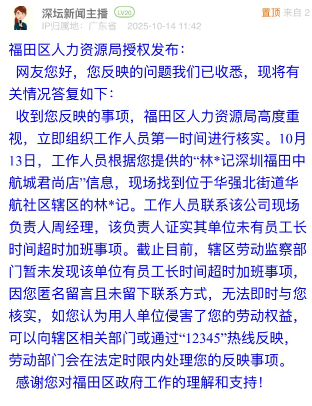 优化建议:网民投诉的核心有两点,一是外包公司无劳务派遣资质却代缴社保、发放工资,二是工作时间过长。福田区人力资源局虽回应已核实涉事餐饮单位“无长时间超时加班”,但对网民反映的外包公司无资质这一关键问题未作回应。此情况反映出,资质核查工作亟需加强,如对相关餐饮单位开展用工合规专项检查,以精准举措解决无资质外包这一核心痛点,提升市民对劳动者权益保障工作的认可度。