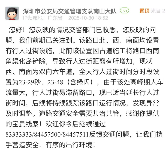 案例点评:南山交管部门在24小时内对市民所反馈的问题进行答复,展现出精准、高效的治理态度,既说明过街时间短的原因,又根据该路口在高峰期人流大的实际情况,适当延长过街时间,体现出“因需调整、务实便民”的理念。回应中,该部门还强调后续将持续跟踪路口通行情况、及时优化调整等,展示了精细化治理的决心和理念。