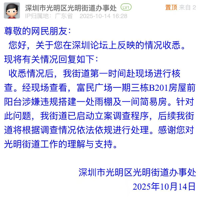 优化建议:在本帖文中,街道办的回应说明建筑涉嫌违规搭建,已启动立案调查程序,但后续网民留言表示,已在2022年4月起向12345投诉相关情况,仍未处理好,对相关部门的处理情况产生质疑。对此类长期投诉的回应,建议适当说明未能及时处理完结的客观原因,如历史遗留问题复杂、处置涉及多部门协调或相关认定流程较为复杂等,并尽量明确“预计处理时限”,回应市民对“依法履职”的期待。