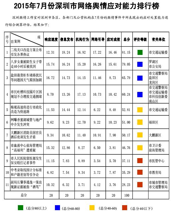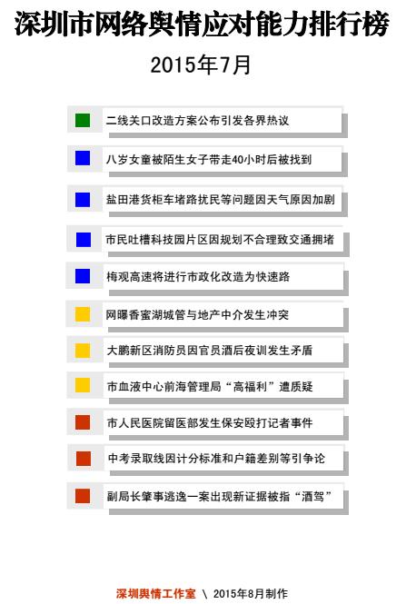 —— 2015年7月份深圳市各区各部门网路舆情应对情况综述