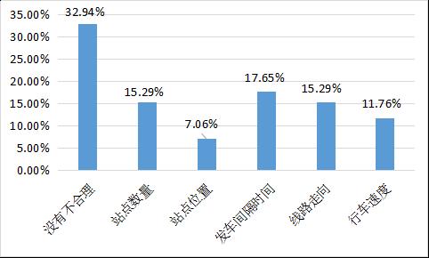 在对布心片区公交服务合理性的调查中,对该片区公交服务基本满意的被调查居民有32.94%,认为该片区“发车间隔时间过长”“公交站点数量设置不合理”和“公交站位置设置不合理”的被调查居民分别占到了17.65%、15.29%和7.06%,对公交线路走向不满意的占到了15.29%,对公交行车速度表示不满意的有11.76%。