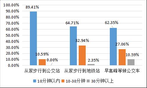 (三)近九成被调查居民能够在10分钟内步行到公交站,六成被调查居民早高峰候车时间少于10分钟,说明公交承载力大、地铁辐射力不足。
