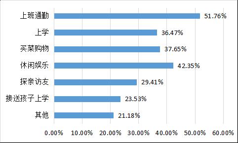 从该片区居民出行的主要目的来看,上班通勤及休闲娱乐的出行需求占比较大,分别达到51.76%及42.35%。此外,上学、买菜购物、探亲访友等出行目的也占据一定比重,分别达到36.47%、37.65%及29.41%。以调查结果来看,该片区前往各中心区进行通勤、娱乐、购物的出行需求较大,远距离出行以乘坐公交车、地铁出行为主;近距离出行如上学、买菜购物、接送孩子上学等,则较多选择步行或使用共享单车出行。