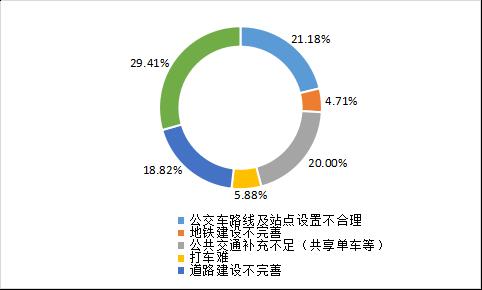 认为布心片区交通不便的被调查居民中,21.18%表示该片区公交车路线及站点设置不合理,20%反映该片区共享单车等慢行系统对公共交通补充不足,4.71%的被调查居民认为该片区地铁建设不完善。另外,有18.82%的被调查居民反映该片区道路建设不完善,有5.88%的被调查居民则称该片区存在打车难的问题。