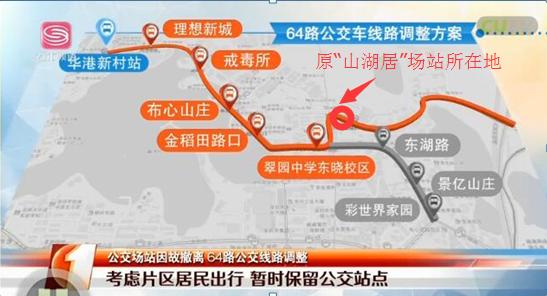 如图2所示,本次“山湖居场站”搬离,64路公交线路总站改为“华港新村”场站,在原“山湖居”场站处设置“布心山湖居”站点,并在经过“翠园中学东晓校区”站点后往北行驶,途经“布心山湖居”站点、翠荫路(橙色路段)到达沙湾路,随后向南驶入爱国路;取消停靠东湖路(灰色路段)的“东湖路”“景亿山庄”“彩世界家园”三个站点。该线路调整方案在片区居民内引发争议。