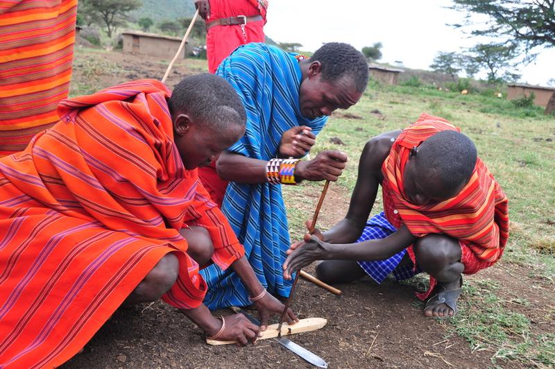 马赛人盛行一夫多妻制。成年男子蓄发编成小辫,年轻妇女剃光头。近年来,定居的马赛儿童开始上学,已出现少数马赛人知识分子。图为为游客表演钻木取火等节目的马赛人。李仁奇 摄