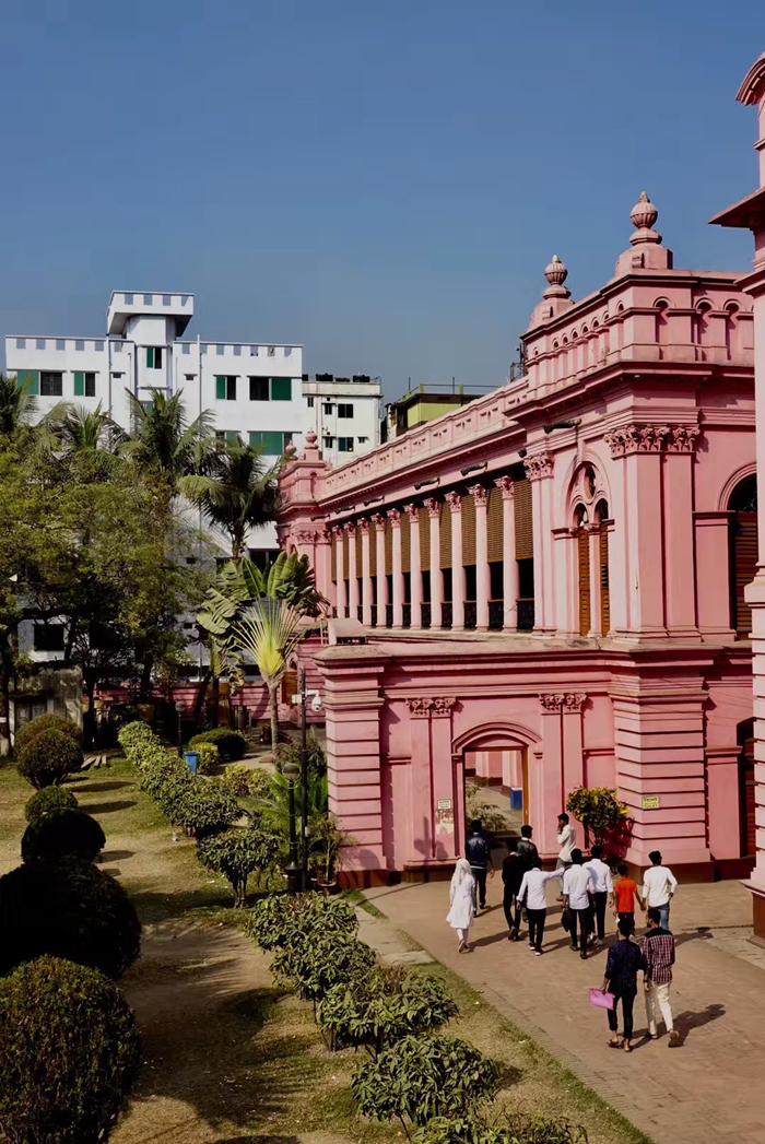 距孟加拉恒河渡口不远的地方有一座粉红色宫殿式的豪华建筑。那是1872年一位名叫阿赫桑曼济勒的地主在法国人留下的仓房基础上改建的私邸,后来曾在一次龙卷风袭击时受创。李仁奇 摄
