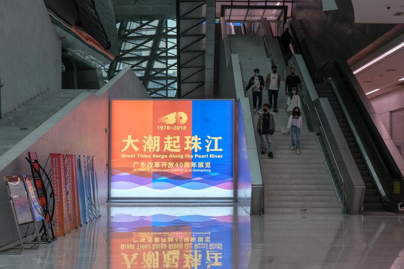 一幅68米长的新媒体艺术长卷上,水彩画、沙画、动态照片等不断变幻,通过4个篇章生动展现广东改革开放40年城乡面貌的巨变和百姓生活的变迁。这是国内面积最大、分辨率最高、最具创新形式的多媒体艺术投影,使用了12台两万流明(投影机亮度参数)的激光投影机,营造出非凡的艺术效果。