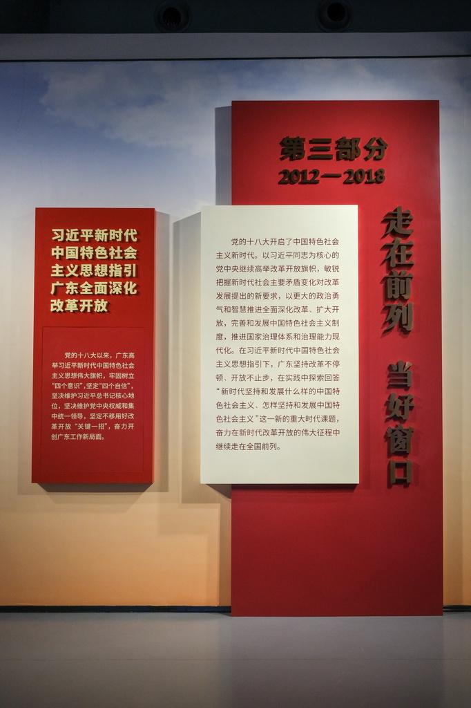 展览内专门开辟科技创新、智能制造板块,展出广汽、华为、大疆、富士康、大族激光、美的、格力、珠海云洲智能等广东代表性企业的高科技产品和天河二号超算系统、散裂中子源等重大科技创新项目模型。这些企业的创新成果,向观众展示着“科技之都”的魅力。同时配套展出《改革再出发》等一批反映改革开放题材的优秀美术作品,以艺术的形式生动展现改革开放的思想内涵和发展成就。
