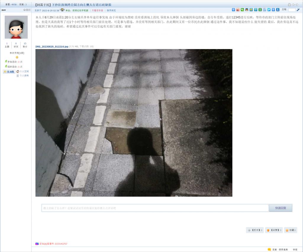 5、帖文《下沙往深圳湾公园方向左侧人行道石砖缺损》