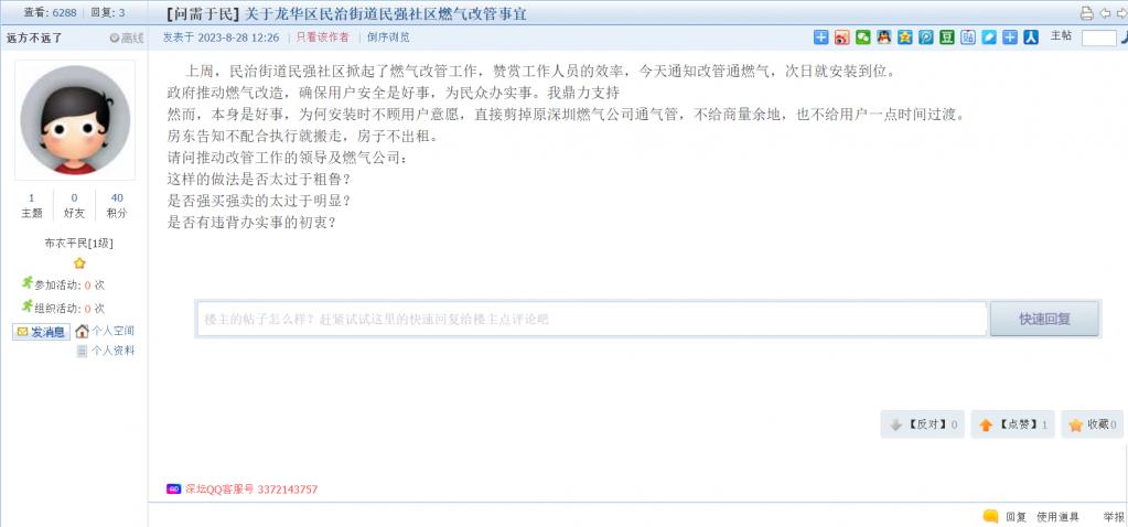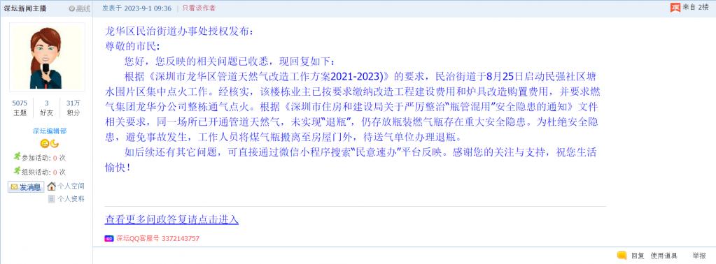 2、帖文《关于龙华区民治街道民强社区燃气改管事宜》
