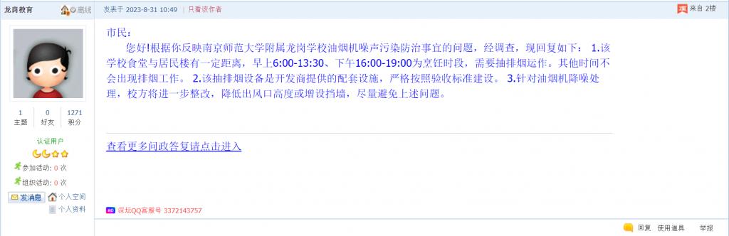1、帖文《南京师范大学附属龙岗学校楼顶风机噪音整改事宜》