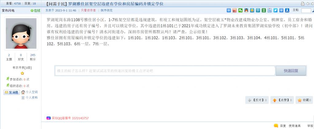 13、帖文《罗湖雅仕居架空层违建有学位和房屋编码并锁定学位》
