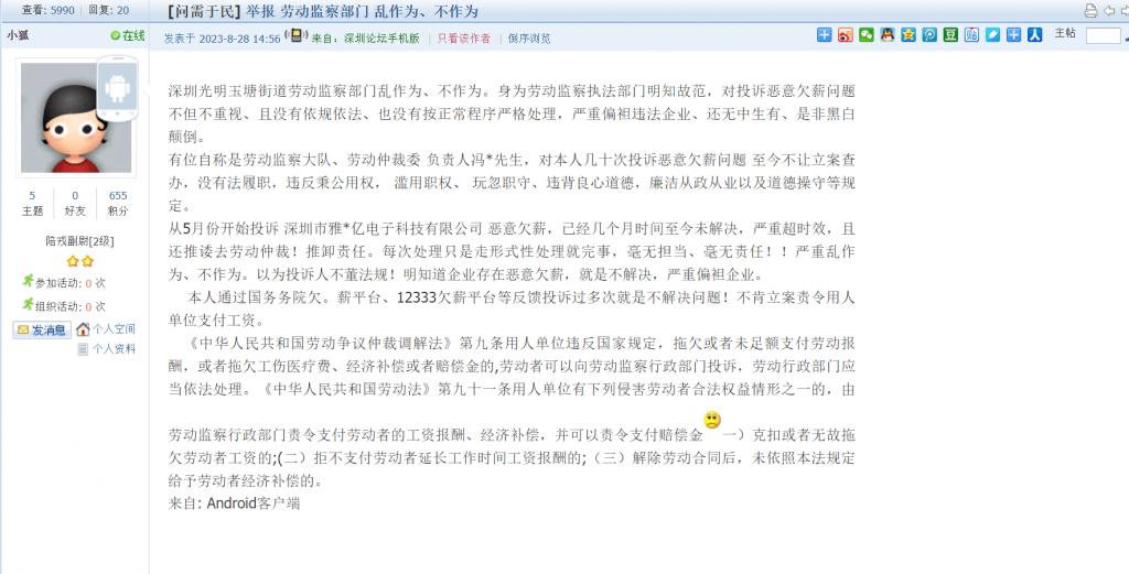 3、帖文《举报劳动监察部门乱作为、不作为》