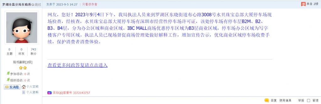 网友,您好!2023年9月4日下午,我局执法人员来到罗湖区东晓街道布心路3008号水贝珠宝总部大厦停车场现场检查,经核查,水贝珠宝总部大厦停车场有深圳市经营性停车场许可证,该处停车场有停车层B2M、B2、B3、B4层,分为办公区域和商业区域。IBC MALL商场优惠停车区域为B3层商业区域,停车场办公区域为写字楼客户专用区域。执法人员已现场督促商场管理处做好解释工作,增加宣传告示,优化商业区域停车场收费手续,保护消费者消费体验。